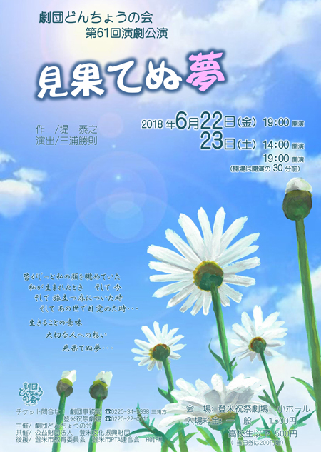 劇団どんちょうの会 第61回公演 『見果てぬ夢』 作 /堤 泰之 演出/三浦勝則 主催/劇団どんちょうの会 共催/公益財団法人 登米文化振興財団 ◆公演日程 2018年6月22日(金)@19:00 6月23日(土)A14:00 6月23日(土)B19:00 (開場は開演の30分前) ◆入場料金 一般/1,500円 高校生以下/500円 (※当日券は200円増) ◆会場 登米祝祭劇場 小ホール |