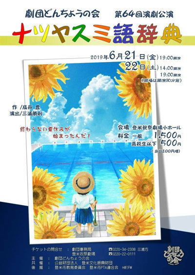 | 劇団どんちょうの会 第64回公演 『ナツヤスミ語辞典』 作/成井 豊 演出/三浦勝則 ◆公演日程 2019年6月21日(金)@19:00 6月22日(土)A14:00 6月22日(土)B19:00 ◆入場料金 一般/1,500円 高校生以下/500円 (※当日券は200円増) ◆会場 登米祝祭劇場 小ホール ◆お問合せ 劇団事務局0220-34-2338(三浦方) |
